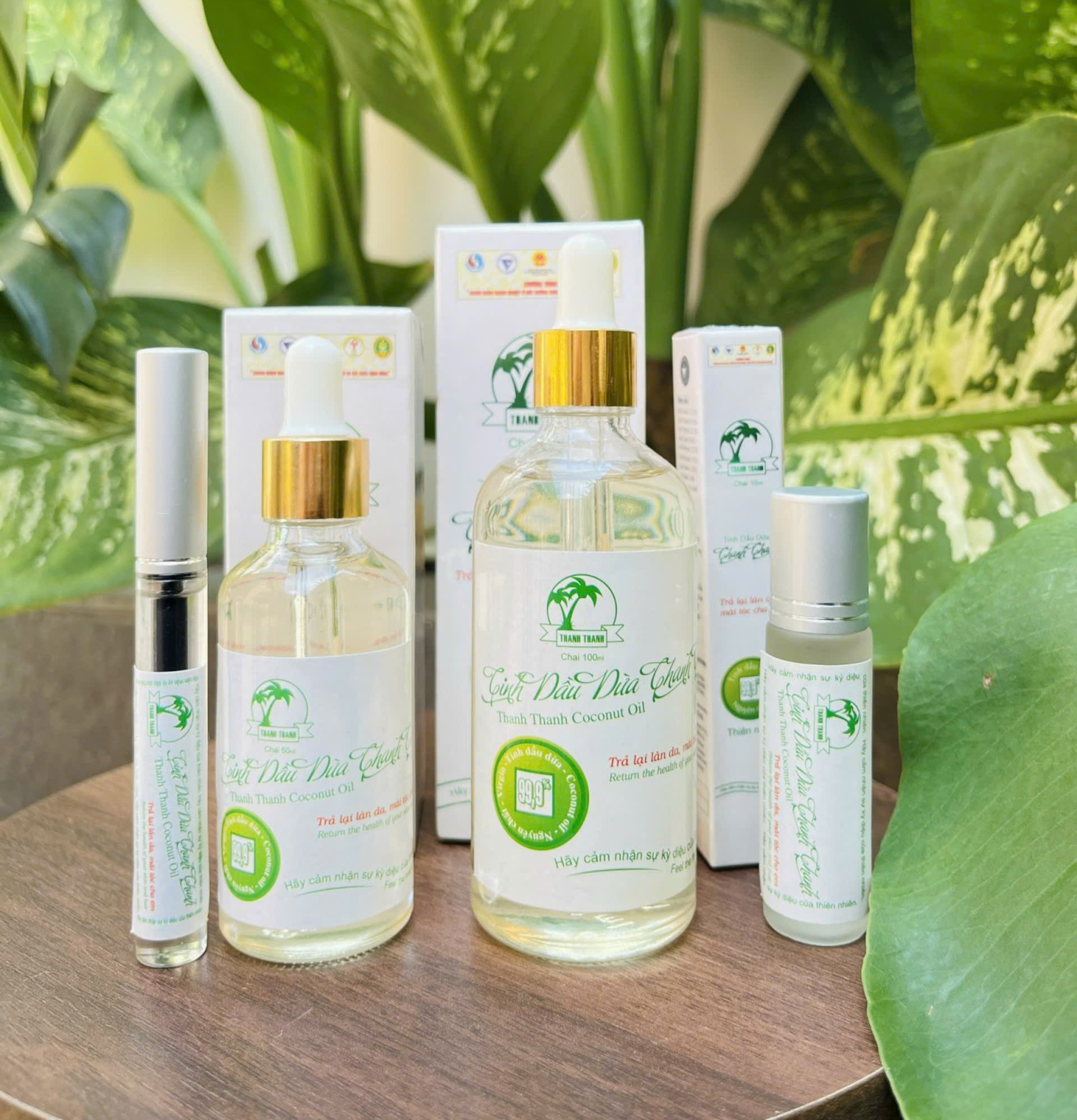 Tinh Dầu Dừa: Tinh dầu dừa của Thanh Thanh là sản phẩm chủ lực, được sản xuất từ nguyên liệu dừa tươi chọn lọc theo quy trình ép lạnh hiện đại. Điều này giúp giữ lại toàn bộ dưỡng chất quý giá như axit béo và vitamin E tự nhiên, giúp nuôi dưỡng làn da, mái tóc, và thậm chí hỗ trợ sức khỏe. Thanh Thanh tự hào về chất lượng tinh dầu dừa nguyên chất, không chất bảo quản, mang lại lợi ích vượt trội cho việc làm đẹp và chăm sóc sức khỏe.